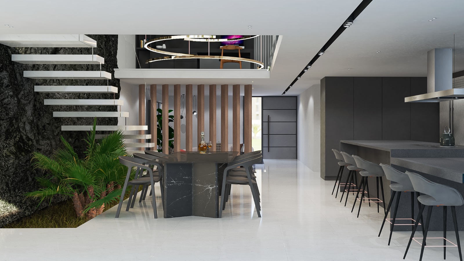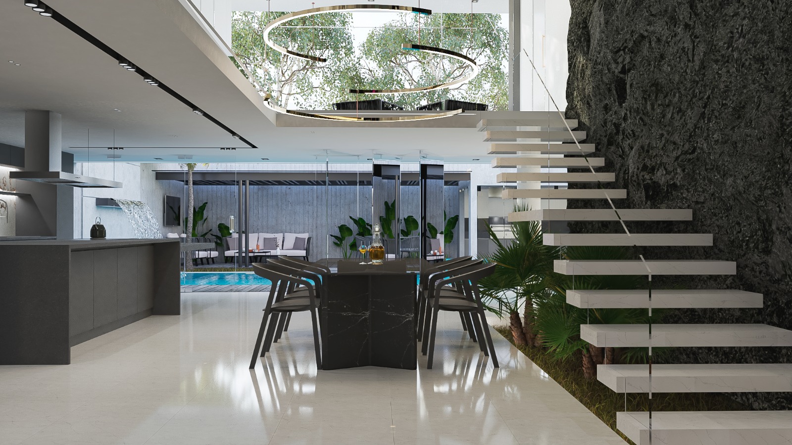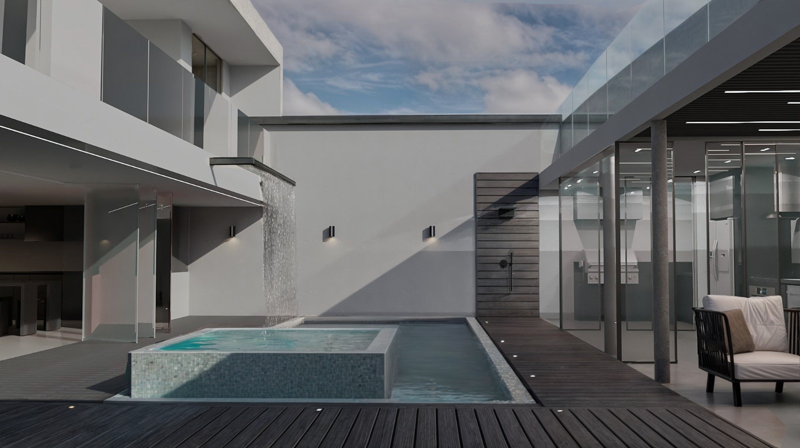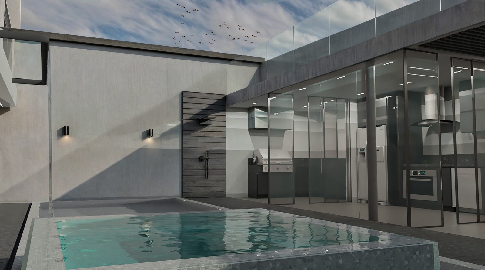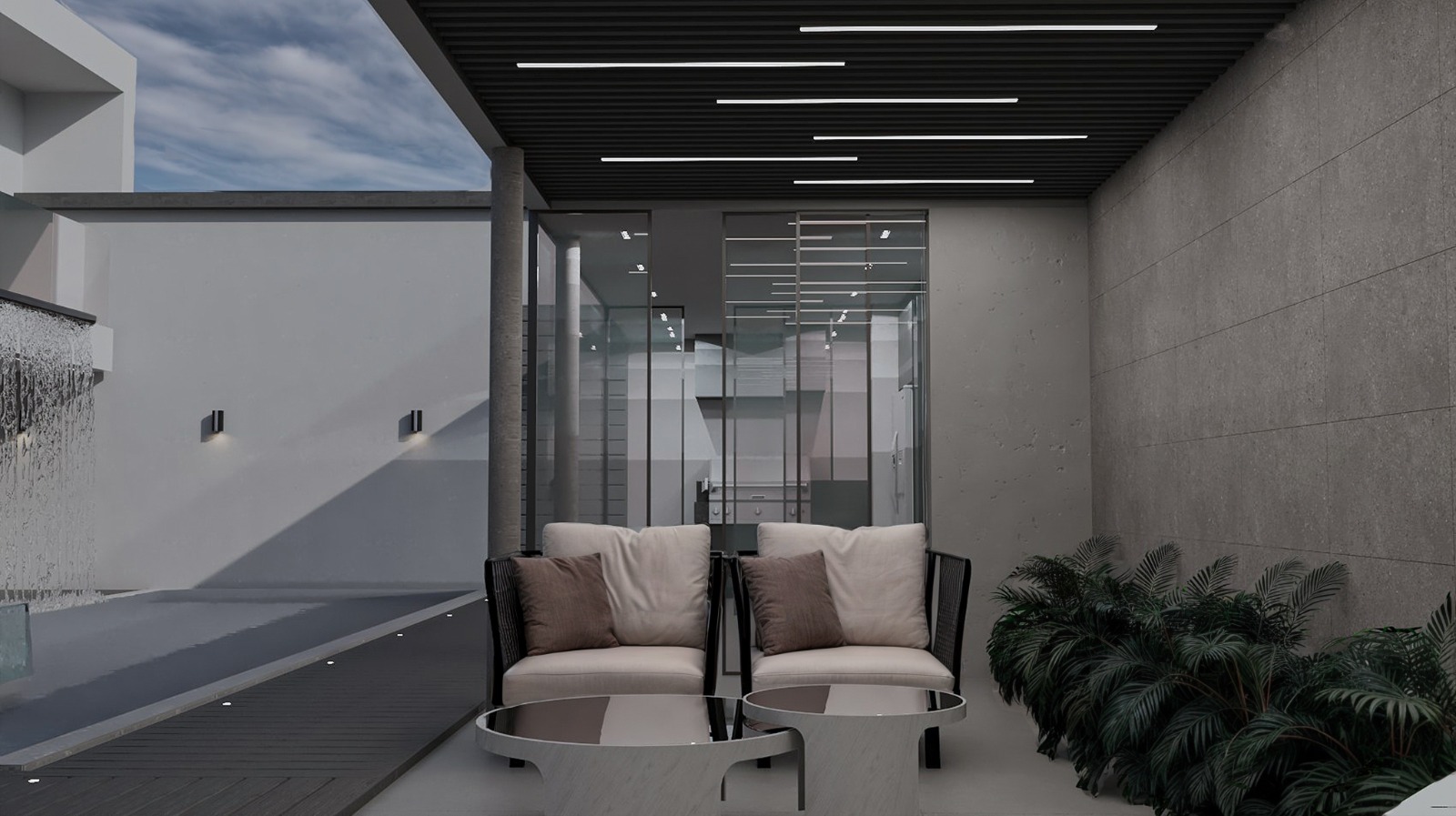 El cierre de obra es el momento donde la ingeniería se retira para dejar que la arquitectura hable. En esta casa, los detalles finales se centraron en exaltar la escala vertical y consolidar el magnetismo de la piscina, logrando que el conjunto se perciba como una sola pieza monolítica de diseño moderno, el vacío que creamos al romper la losa se convirtió en el lienzo principal de la casa. Aplicamos acabados en tonos grises industriales que recorren toda la altura de las paredes, sin juntas visibles, para enfatizar la verticalidad. Esto hace que el ojo viaje desde el suelo hasta el techo sin interrupciones, maximizando la sensación de grandeza. La piscina se detalló para ser el ancla visual tanto del interior como del exterior.