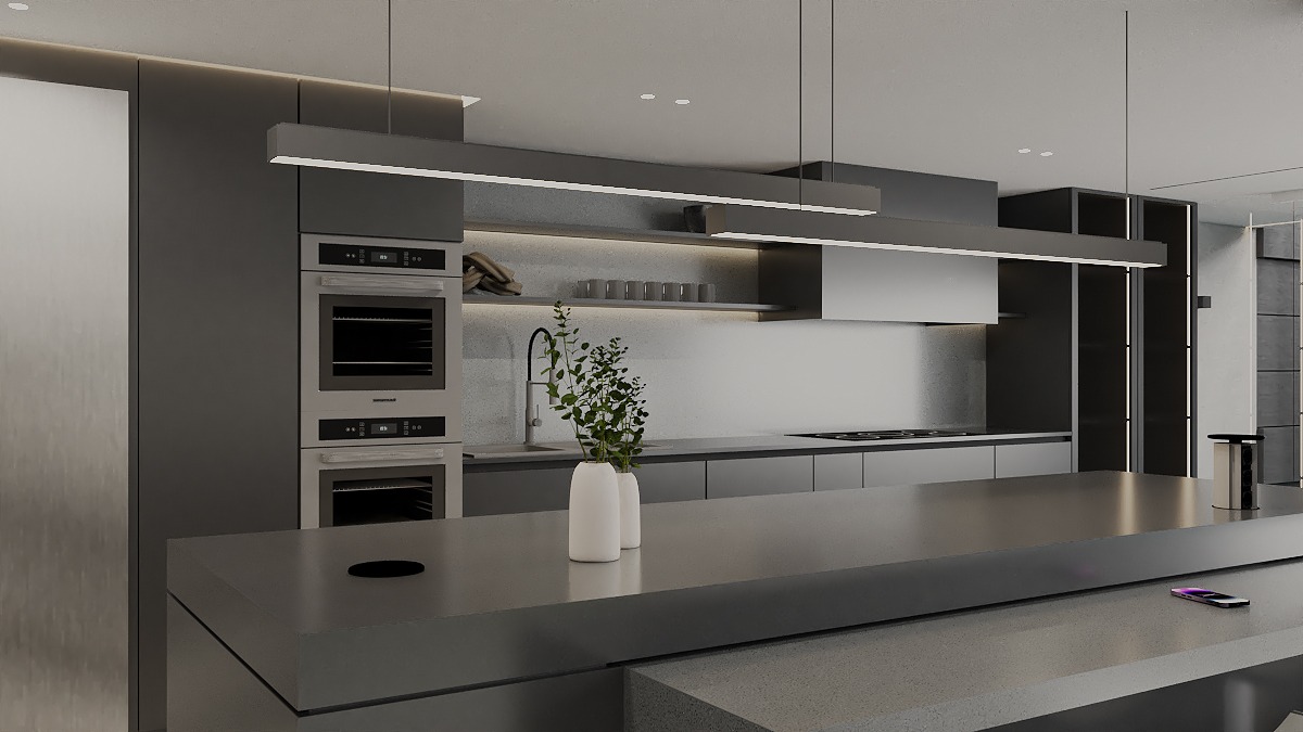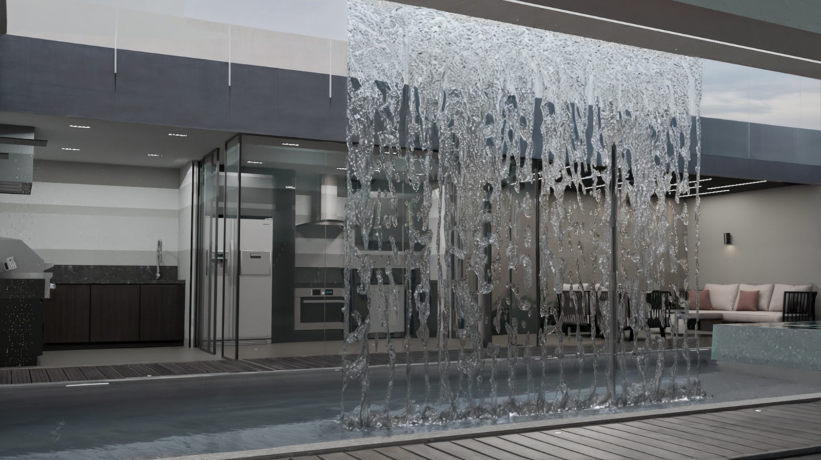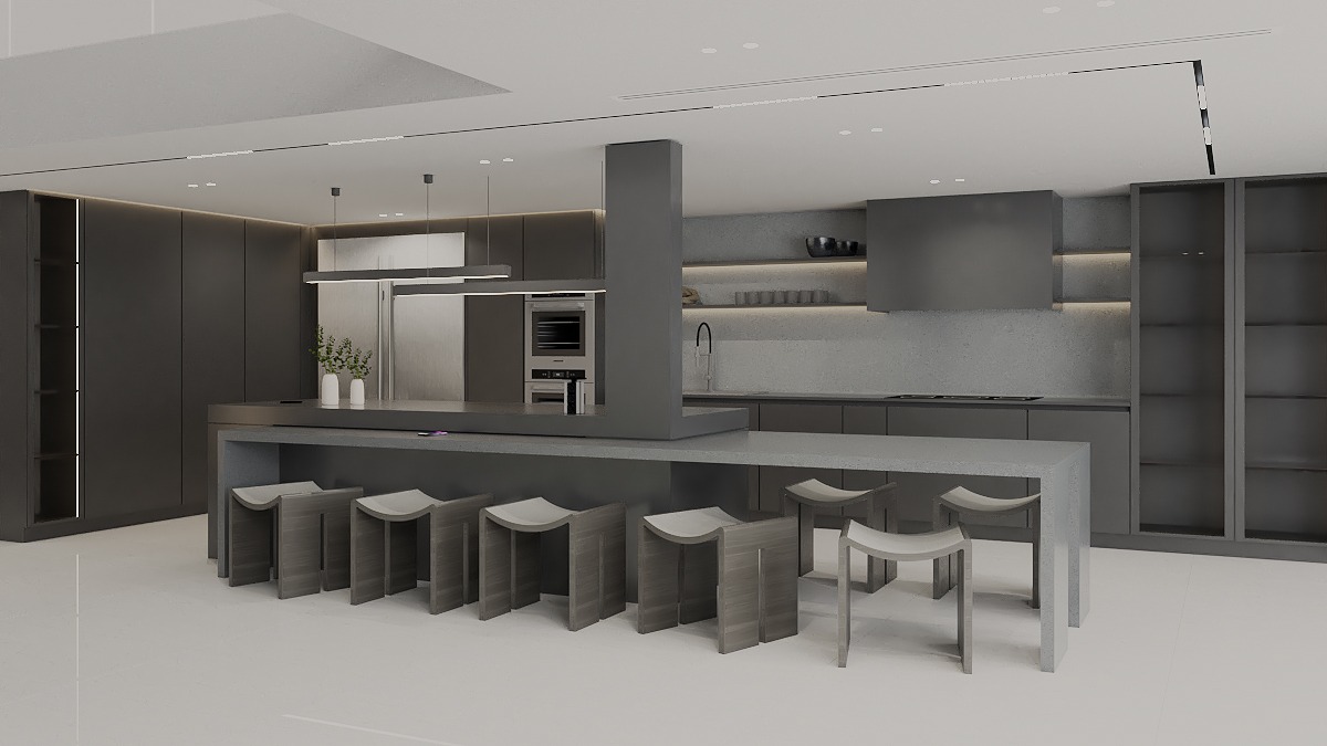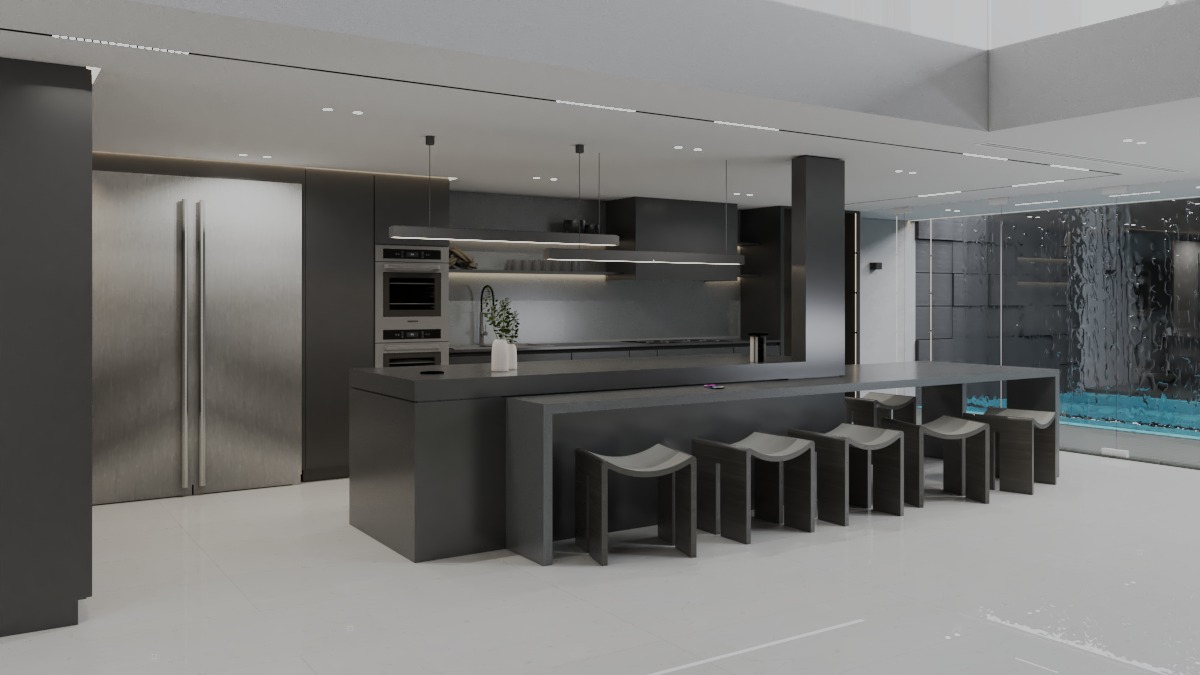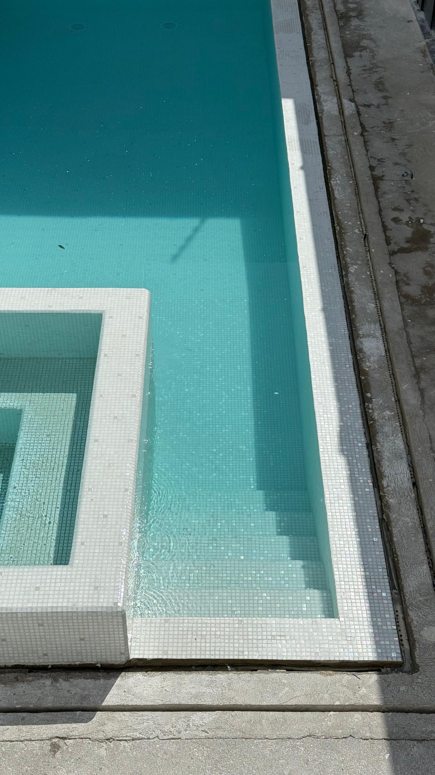 El cierre de obra es el momento donde la ingeniería se retira para dejar que la arquitectura hable. En esta casa, los detalles finales se centraron en exaltar la escala vertical y consolidar el magnetismo de la piscina, logrando que el conjunto se perciba como una sola pieza monolítica de diseño moderno, el vacío que creamos al romper la losa se convirtió en el lienzo principal de la casa. Aplicamos acabados en tonos grises industriales que recorren toda la altura de las paredes, sin juntas visibles, para enfatizar la verticalidad. Esto hace que el ojo viaje desde el suelo hasta el techo sin interrupciones, maximizando la sensación de grandeza. La piscina se detalló para ser el ancla visual tanto del interior como del exterior.