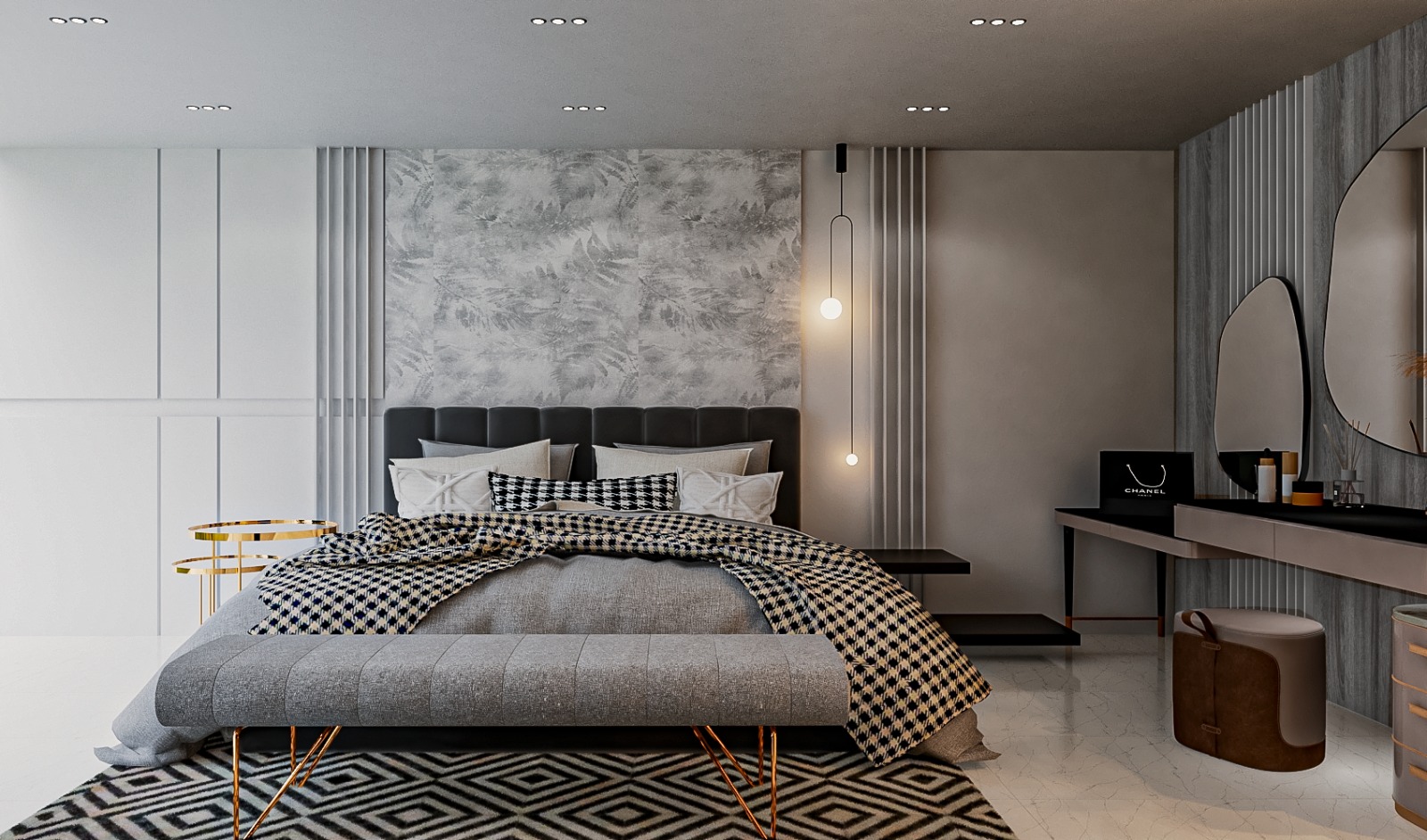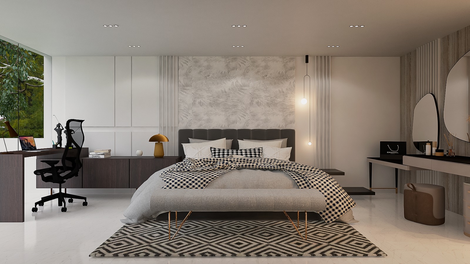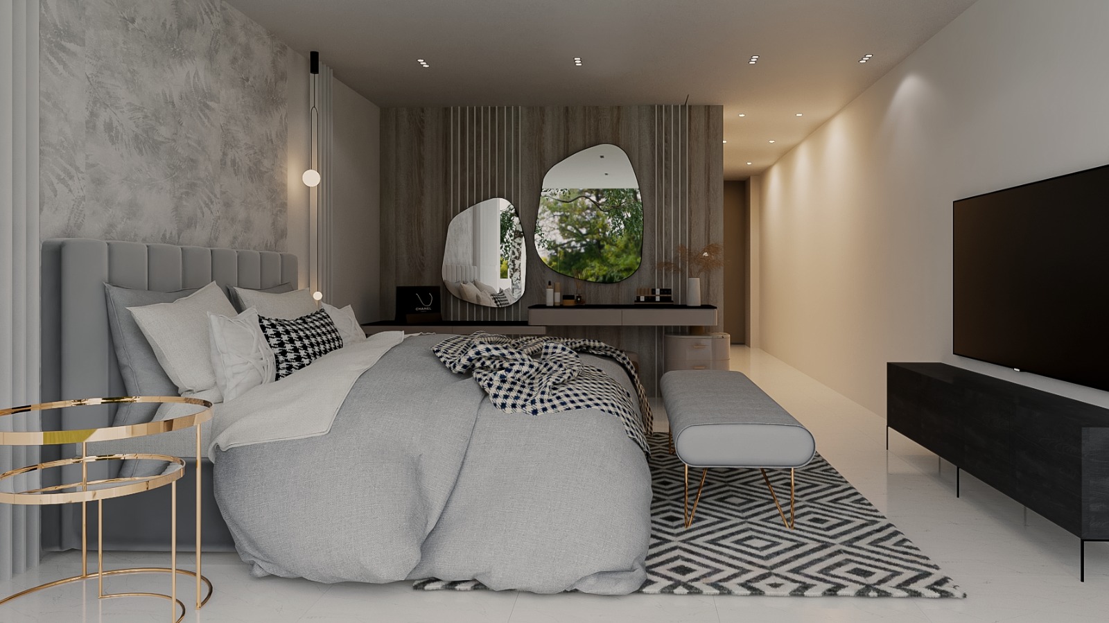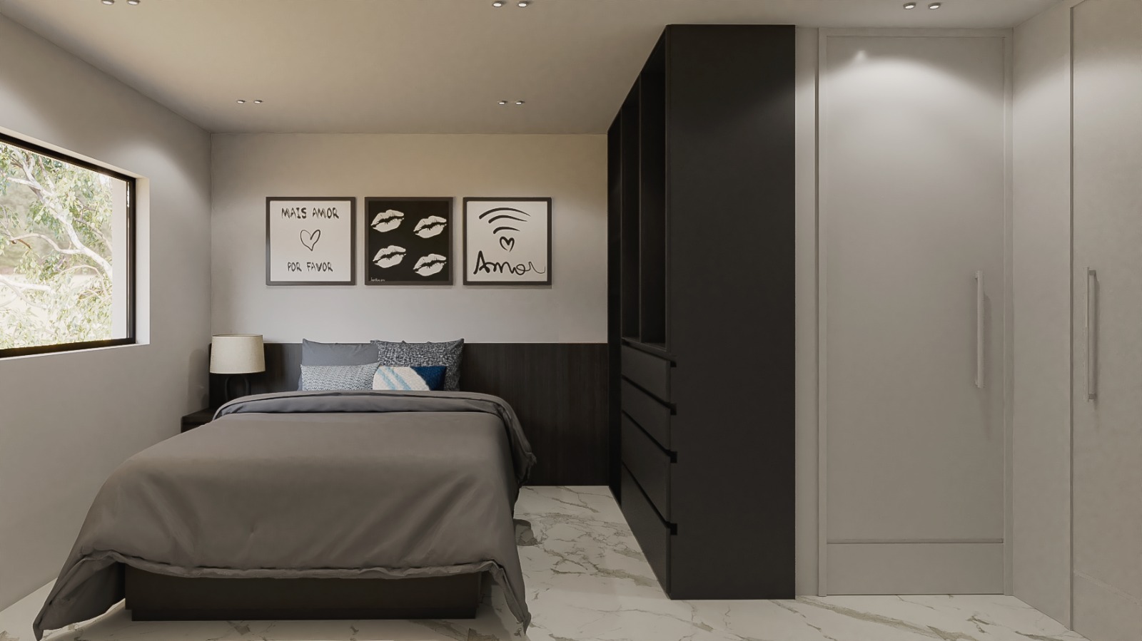El diseño estratégico ignoró los límites de la distribución original para crear un esquema funcional totalmente nuevo, el cuarto principal fue proyectado como el centro de control y descanso de la vivienda, utilizando un diseño de eje visual directo, no se limita a sus muros; se expande hacia el exterior mediante un balcón-terraza privado. El diseño estratégico garantiza que, desde el punto de descanso, la vista sea ininterrumpida hacia la piscina y el jardín.